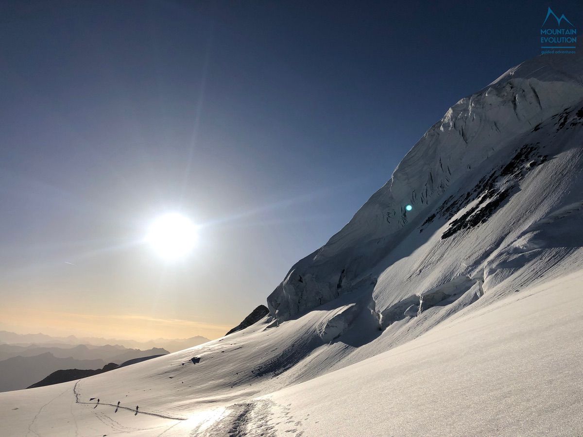 La salita dello spigolo Nord è stata magica. Il Rifugio Saas Fura era ancora chiuso e sulla montagna eravamo da soli. È stato bellissimo essere da soli su una delle montagne simbolo delle Alpi. Non capita di frequente di vivere questa esperienza ormai.